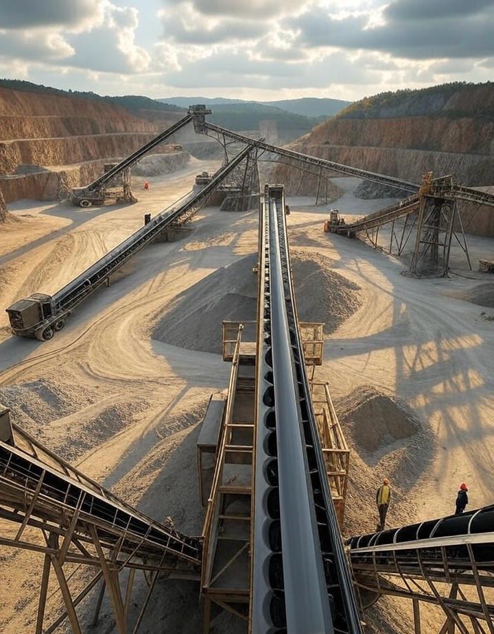 Transport de minerais, charbon et granulats abrasifs sous fortes charges. Rouleaux renforcés avec joints étanches et revêtements anti-abrasion pour environnements extrêmes.