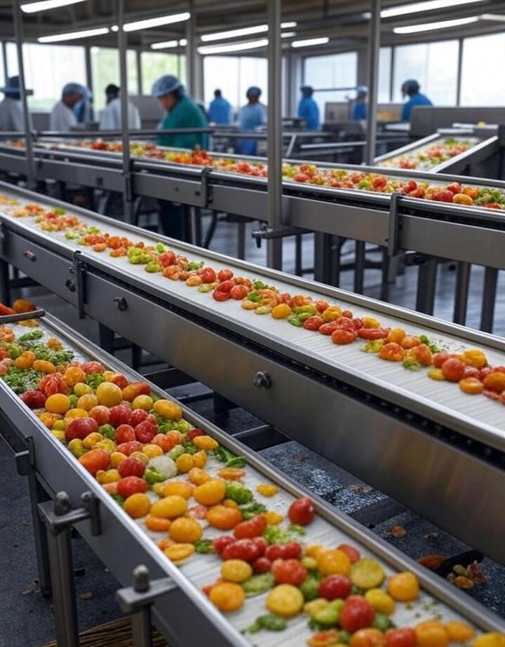 Transport de céréales, sucre ou produits alimentaires. Rouleaux hygiéniques en acier inoxydable ou polyuréthane alimentaire, facilement nettoyables.